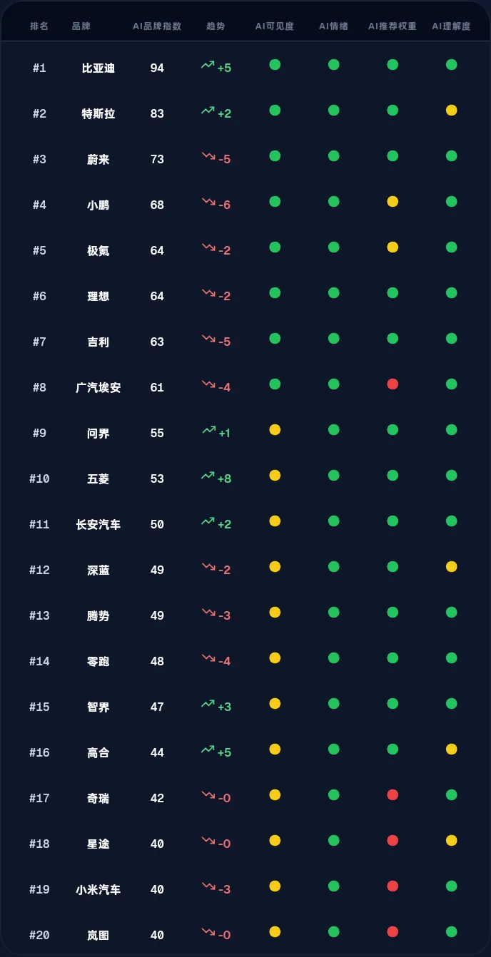 比亚迪以94分断层领先,趋势上涨+5,AI可见度、情绪、推荐权重、理解度五项指标全绿,展现出压倒性的AI生态优势特斯拉83分稳居第二,但AI理解度出现黄灯警示(⚠️),本土化内容适配或成短板