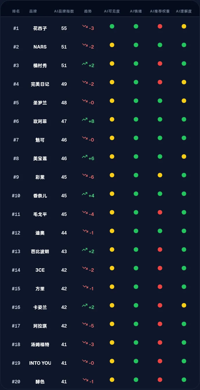 完美日记49分,AI推荐权重+理解度双黄灯,"平价替代"标签在AI语境中价值稀释
