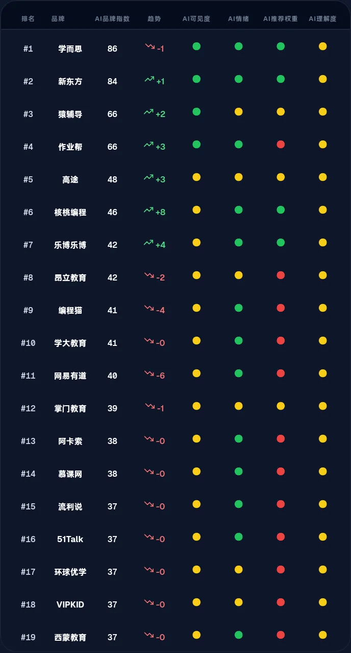 学而思86分居首,AI理解度黄灯(⚠️),"AI+教育"技术叙事尚未完全转化为用户认知新东方84分,趋势微涨+1,全绿指标中唯一理解度黄灯,老牌机构的AI内容表达偏传统猿辅导、作业帮同分66,工具属性强于品牌属性,AI推荐权重双黄灯,"拍照搜题"标签限制信任升级高途48分领跑腰部,但AI情绪、推荐权重、理解度全黄灯,转型阵痛期明显核桃编程暴涨+8分,乐博乐博+4分,少儿编程赛道成唯一增长极11个品牌挤在37-41分"地板区",8家AI推荐权重亮红灯(❌)VIPKID、51Talk、阿卡索、流利说等在线外教赛道全军覆没,政策+AI替代双重绞杀掌门教育、学大教育等1对1模式选手集体沉沦,规模不经济在AI语境中被放大双巨头吃肉,编程课喝汤,其他人连碗都端不稳——教育行业的AI品牌竞争,本质是"谁能让家长相信AI是辅助而非替代"的心理战,编程赛道赢了,外教赛道死了,中间地带正在消失。