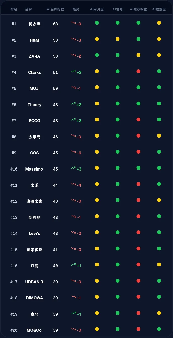 整体特征: 优衣库以68分独占鳌头,第二名H&M骤降至53分,15分断层创四行业之最——但榜首优势≠行业活力,全榜仅5家上涨,服饰AI叙事整体低迷。
