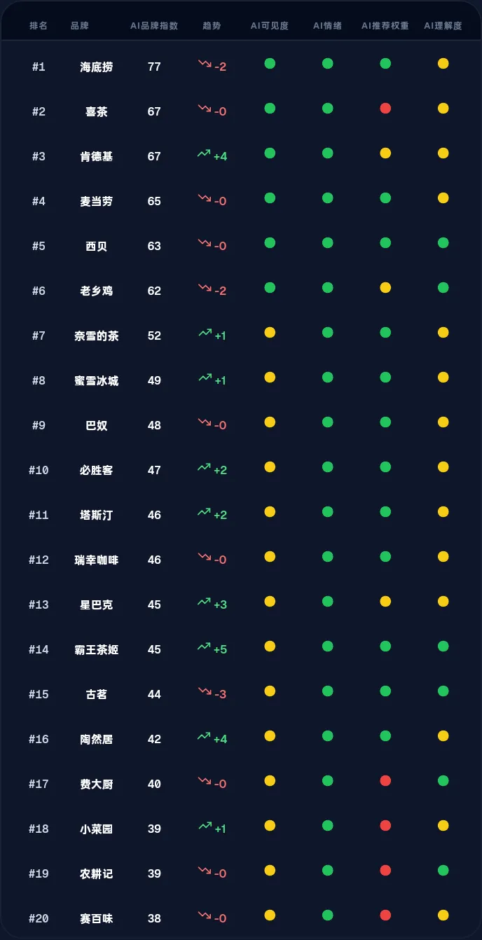 海底捞77分居首,但趋势-2分,"服务主义"的AI内容红利见顶,AI理解度黄灯(⚠️)——算法读不懂"贴心"只能读懂"排队时长"