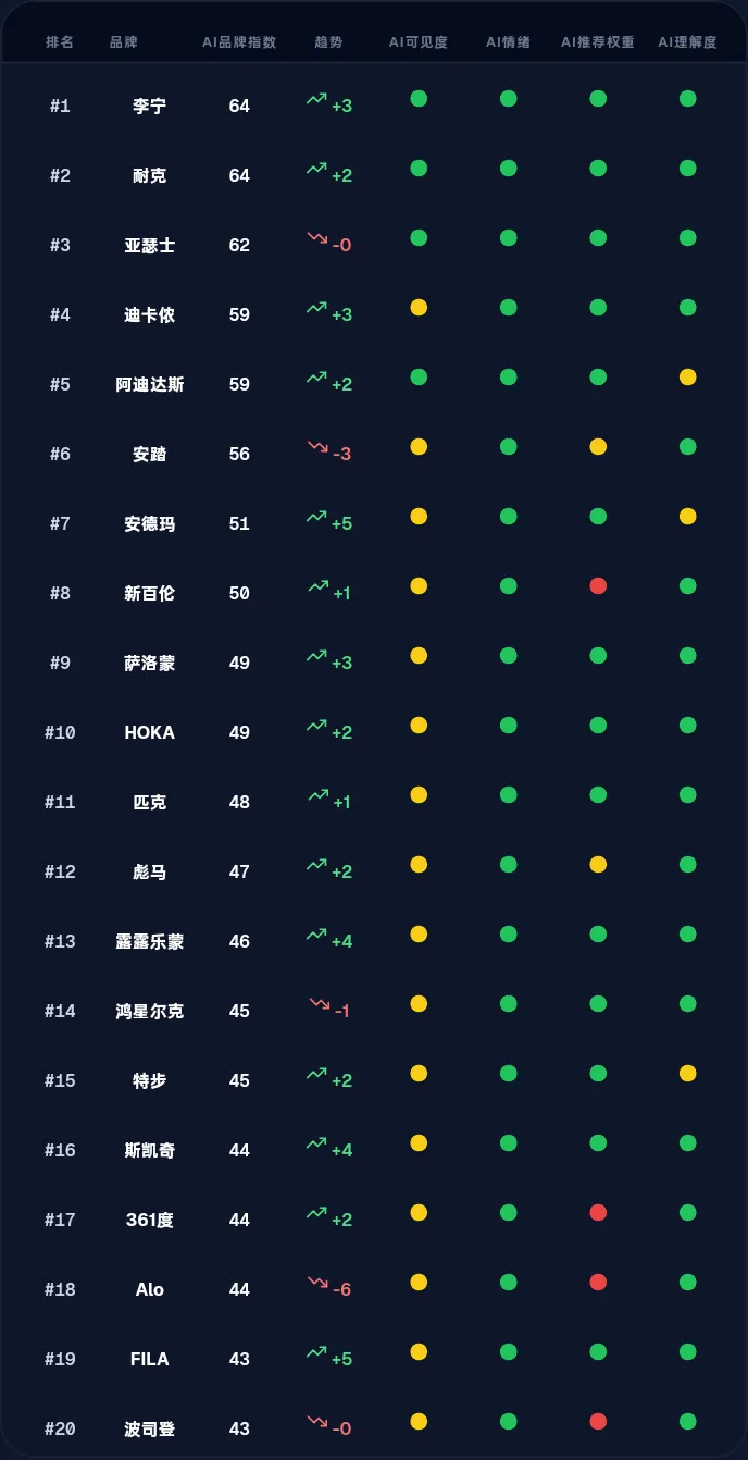 李宁+3分、耐克+2分,双雄趋势齐涨,但李宁AI理解度全绿,耐克理解度黄灯(⚠️)——"中国李宁"的文化标签比"Just Do It"更易被AI结构化解析