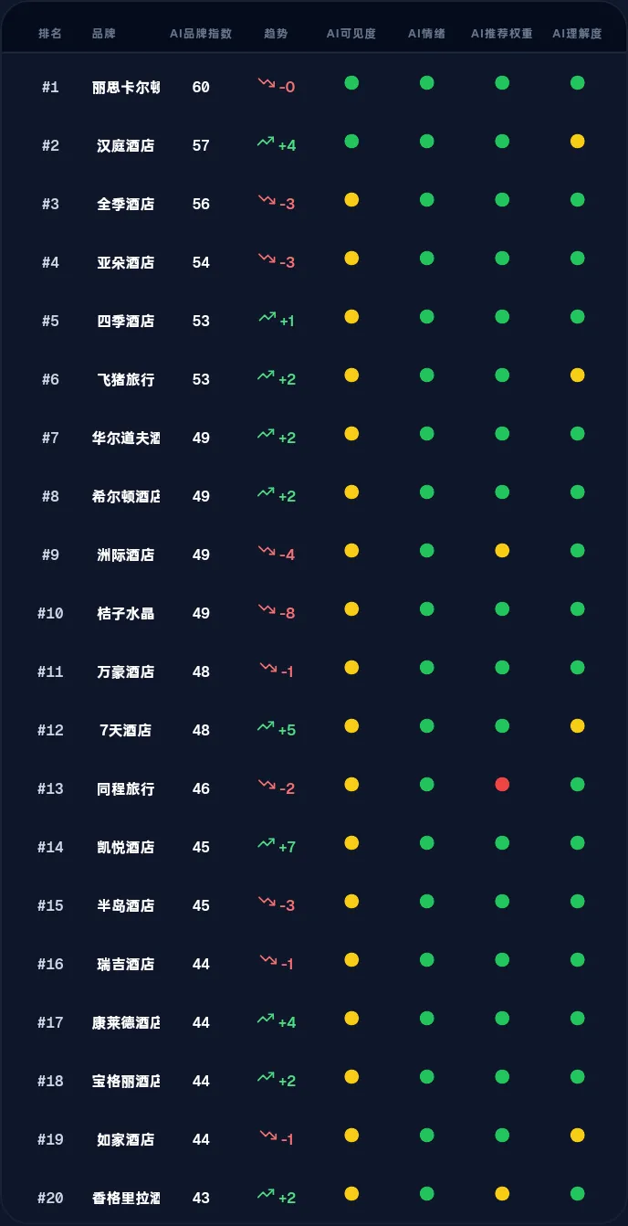 丽思卡尔顿60分唯一全绿,"服务殿堂"定位在AI语境中标签最清晰