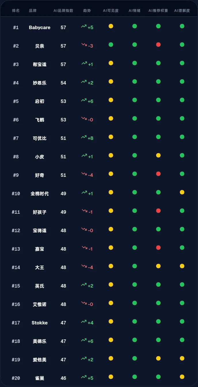 Babycare靠"设计师+全品类"唯一全绿登顶,可优比+8分紧追,启初+6分爆发,美德乐Stokke证明高端功能牌能赢,外资尿裤奶粉集体失速——母婴行业的AI品牌竞争,本质是"把母爱焦虑翻译成数据安全感"的信任战,会讲"安全+颜值"的国货赢了,只会讲"百年历史"的外资输了。