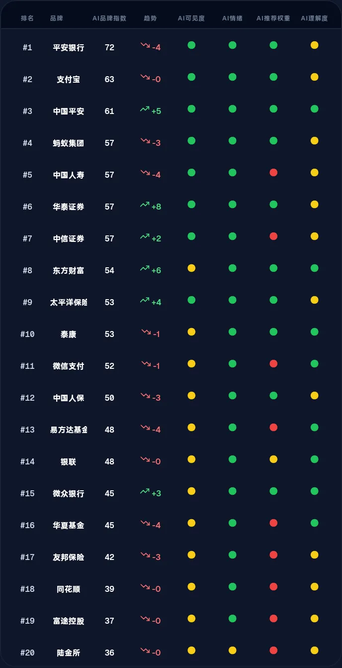 平安系三强霸榜但银行跌券商涨,支付宝唯一支付绿灯,东方财富+6分证明"散户语言"比"专业术语"更易被AI理解,垂直金融平台集体红灯——金融行业的AI品牌竞争,本质是"把风险控制翻译成数据确定性"的信任战,会讲"综合金融故事"的赢了,只会讲"专业工具"的输了。