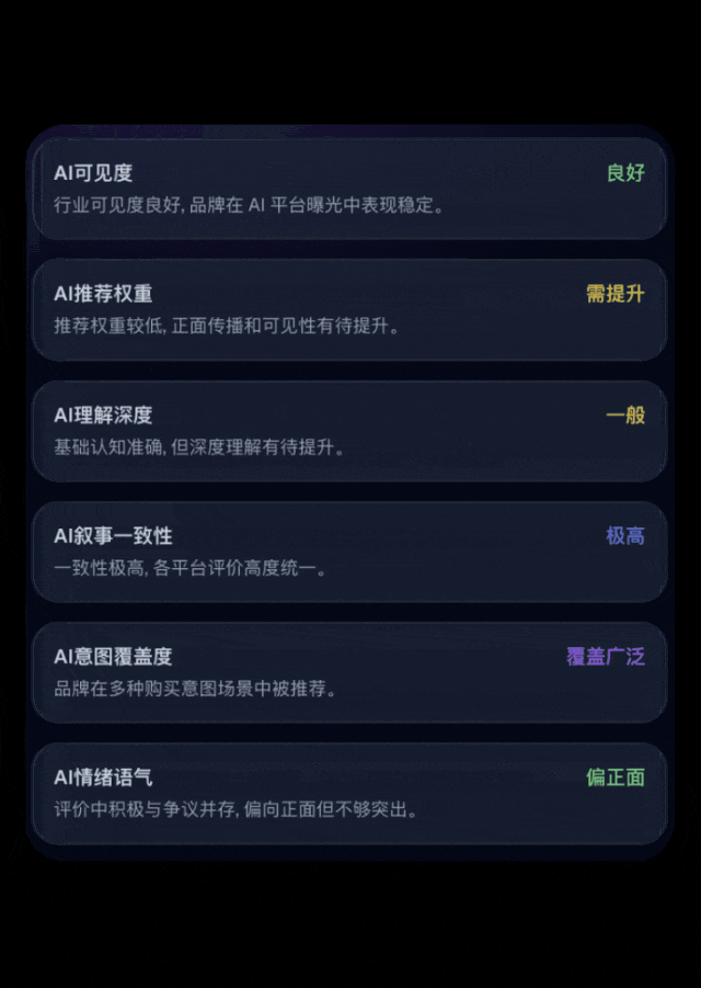 AI品牌指数是一套衡量品牌在AI搜索时代可见度与影响力的综合指标体系。重点关注在可能会影响商业决策(购买/选择/偏好)的AI搜索过程中品牌的整体表现。由六个核心指标构成:AI可见度,AI情绪语气,AI推荐权重,AI理解深度,AI叙事一致性,AI意图覆盖度。