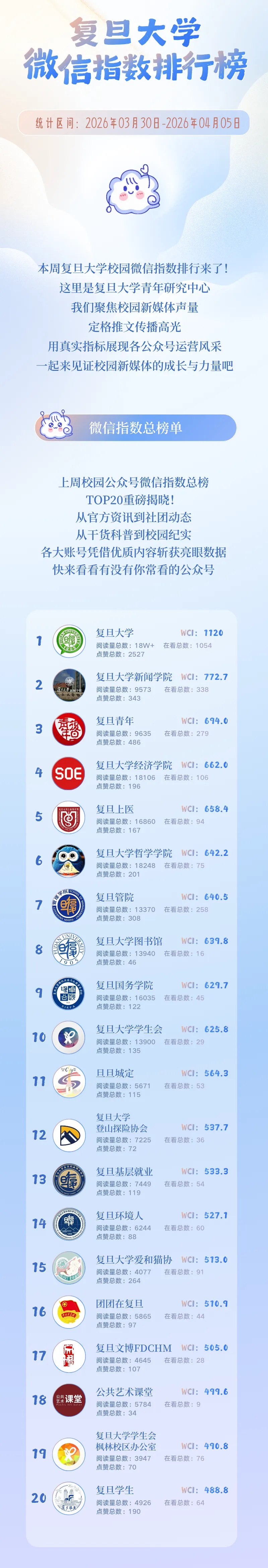 青年数据丨复旦大学校园微信指数排行榜(2026年03月30日—2026年04月05日)