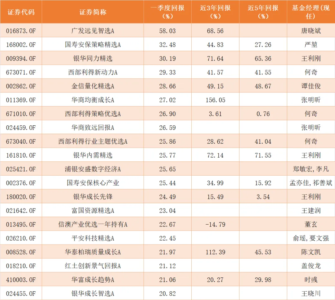 紧随其后的是国寿安保策略精选A,该基金一季度回报32.48%,其重仓方向集中在光模块、AI服务器、算力芯片等数字经济与AI产业链。值得一提的是,国寿安保策略精选A的基金经理严堃,其管理的另一只产品国寿安保数字经济A同期收益率达45.38%,在今年普通股票型基金中排名第一。