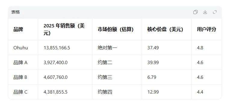 销售额王者:Ohuhu的销售额是第二名品牌A的3.5倍以上,是销量最高的C的3倍。这证明其成功并非依靠低价冲量,而是高客单价、高转化率的综合体现。其“高价高质”的品牌定位已被市场接受和买单。在年销售额已突破千万美元的庞大基数上,Ohuhu仍能实现近30%的增长,这远超一般成熟品牌的增速。
