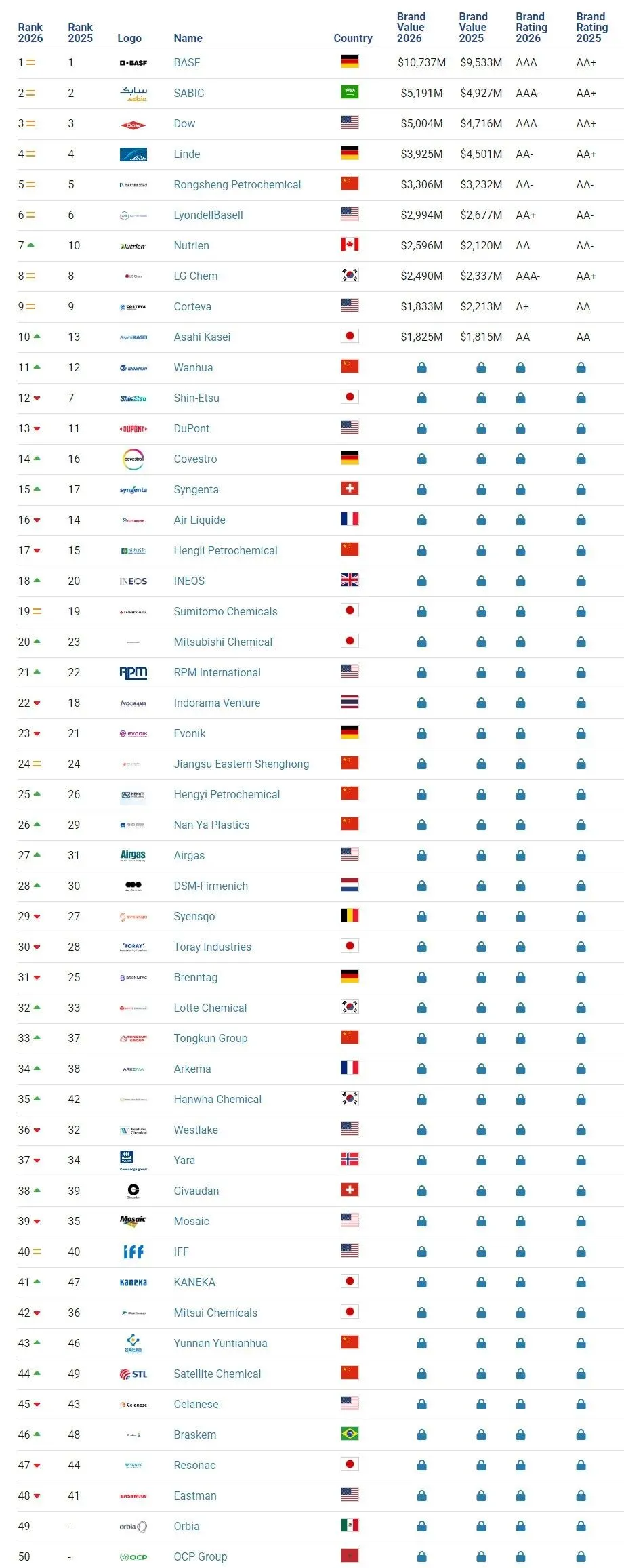 利安德巴塞尔公司(LyondellBasell)以30亿美元的品牌价值位居第六位,品牌价值增长12%,是该行业中品牌价值增长最为显著的企业之一。朝日化成(Asahi Kasei)以18亿美元的品牌价值位居第十位,品牌价值增长1%,从2025年的第11位跃升至该行业最具价值品牌榜单的前十位,这反映出该品牌在充满挑战的行业环境中仍保持了稳定的表现。