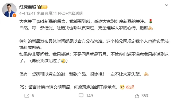 红魔游戏手机产品总经理姜超早前亲自发文爆料,这款Pad新品不是四月就是五月发布,还拍胸脯保证新机“很惊艳,一定不让大家失望”。