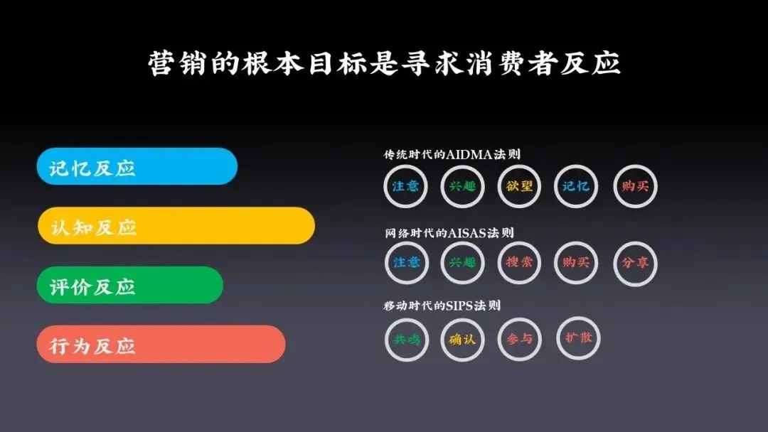 从根本上讲,营销的终极目标是寻求用户反应。一切营销行为最终都是为了引发消费者的四种反应:记忆反应、认知反应、评价反应和行为反应。