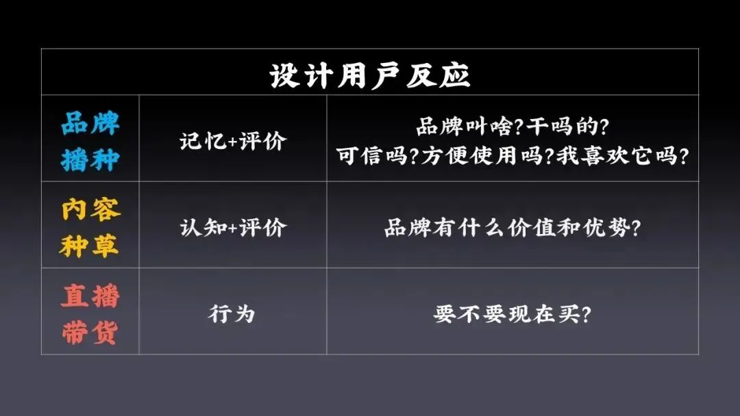 从这四种用户反应来看,直播无法有效唤起记忆反应。毕竟一场直播涉及众多品牌,留给每个品牌的时间很短,消费者很难在这么短的时间内记住品牌。同样,直播也很难在短时间内完成消费者教育,因此也做不了认知反应和评价反应。