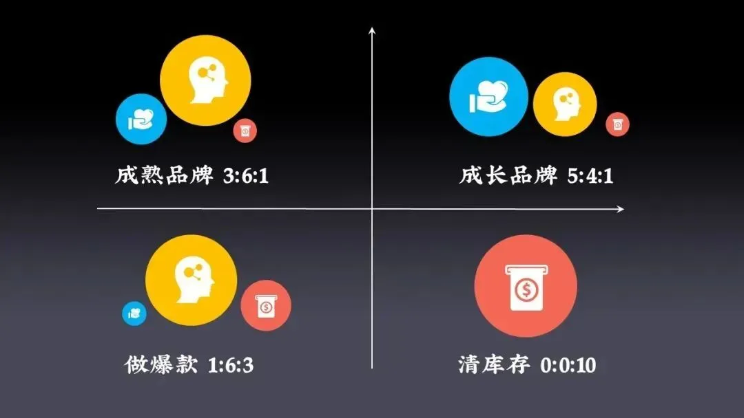 成长品牌 5:4:1这个配比是指,将5成资源用于品牌打造,4成资源用于内容种草,1成资源用于直播带货。成长性品牌需要在品牌建设上投入更多资源,原因有三点:第一,一个初创品牌的早期增长,通常来自产品的自发性增长、渠道扩张,或是依赖创始人自身的资源。但这种增长很容易遇到瓶颈。此时,企业就需要打造品牌,品牌能为企业找到新的增长曲线,为持续增长注入燃料。第二,品牌帮助企业确立自己的核心价值与人设,这样其内容建设才不会东一鳞西一爪,散乱而无中心。品牌是企业内容营销“形散神不散”的那个“神”。第三,品牌是企业重要的护城河。初创企业应迅速打造品牌,树立自身的差异化和竞争壁垒,从而避免对手的跟进与模仿。做爆款 1:6:3打造爆款的核心,是借助内容种草和带货使产品成为一种流行,一种人人仿效的消费风尚。而制造流行的关键是内容。因此,企业应将6成核心资源用于内容种草,3成资源通过产品力和性价比实现电商销售,1成资源用于品牌建设。这1成的品牌建设资源,是为了给流行铺平道路,为消费者的流行性购买提供信心、打消疑虑。清库存 0:0:10这个模式就无需多言了:拿出有诚意的价格去做直播吧。迄今为止,直播电商最具竞争力的卖点,依然是“全网最低价”。
