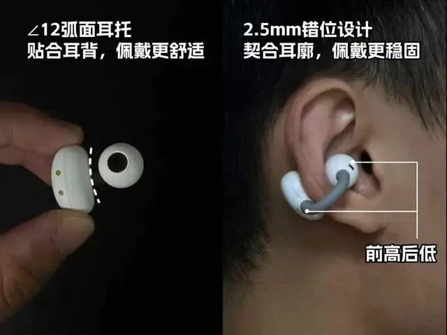 佩戴方面,耳机采用极致轻量化工艺,单耳仅 4.5g,佩戴时几乎感受不到重量,长时间佩戴毫无负担。专属2.5mm 错位结构设计,让耳机自然形成前高后低的贴合角度,完美匹配耳廓曲线;搭配12° 弧面耳托,均匀分散耳部受力点,从根源避免夹耳、胀痛、压痛等问题,久戴依旧舒适。同时夹持稳固度拉满,日常走路、摇头、轻度运动都不易脱落,舒适与稳固两不误。