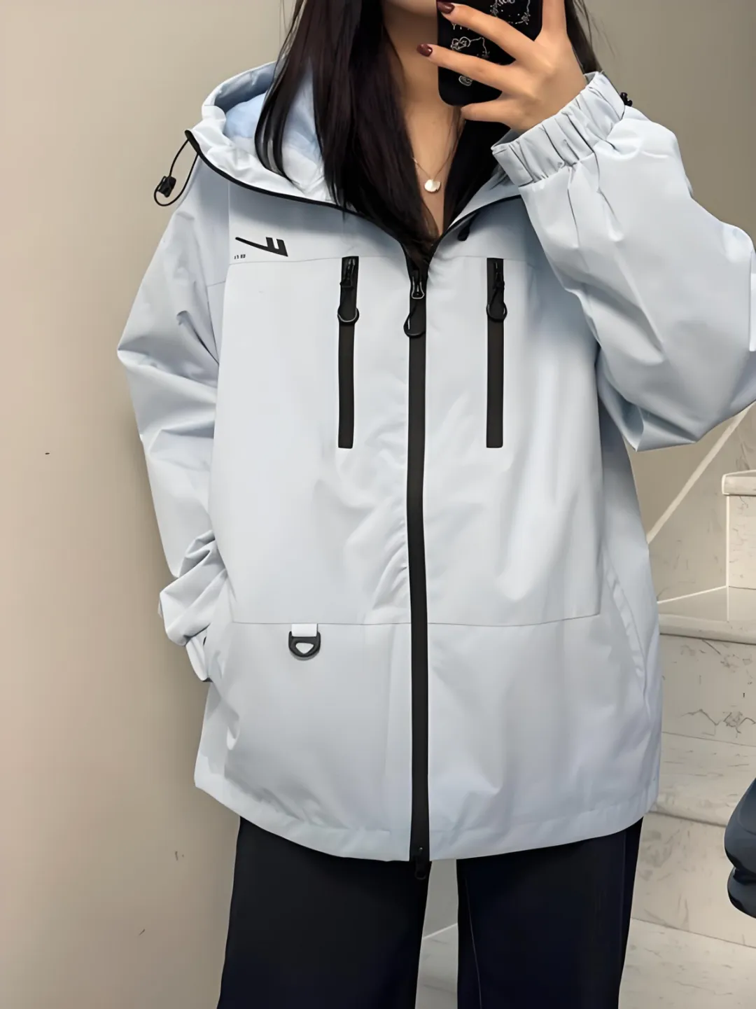 防水指数约11000mm,应对短时中雨够用;透湿率约8200g/㎡/24h,日常活动排湿表现平稳;防风依靠面料密度实现,搭配可调节袖口提升贴合度。定价适中,穿着舒适,适合喜欢户外风格穿搭的人群。