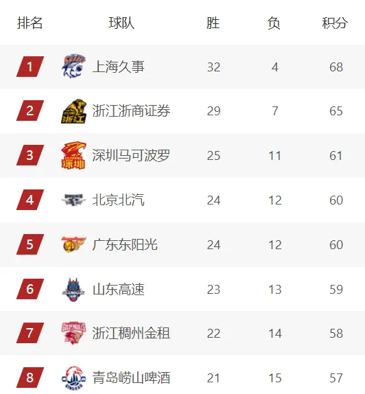 11冠王广东队,他们的战绩和北京队一样,也是24胜12负,排在积分榜第5名。而积分榜第6名则属于山东队,他们的战绩为23胜13负,目前这四支球队将争夺剩下的两个四强席位。从各支球队的状态以及剩下的赛程上来看,深圳队拿到第三名的概率最大,北京队和广东队,他们大概率会争夺剩下的一个四强席位。山东队由于赛程较为艰辛,大概率只能争夺第6名了。