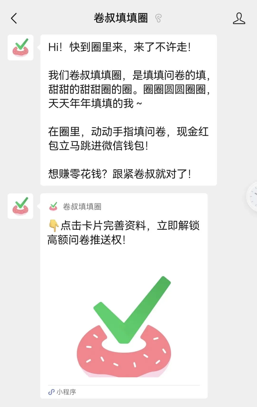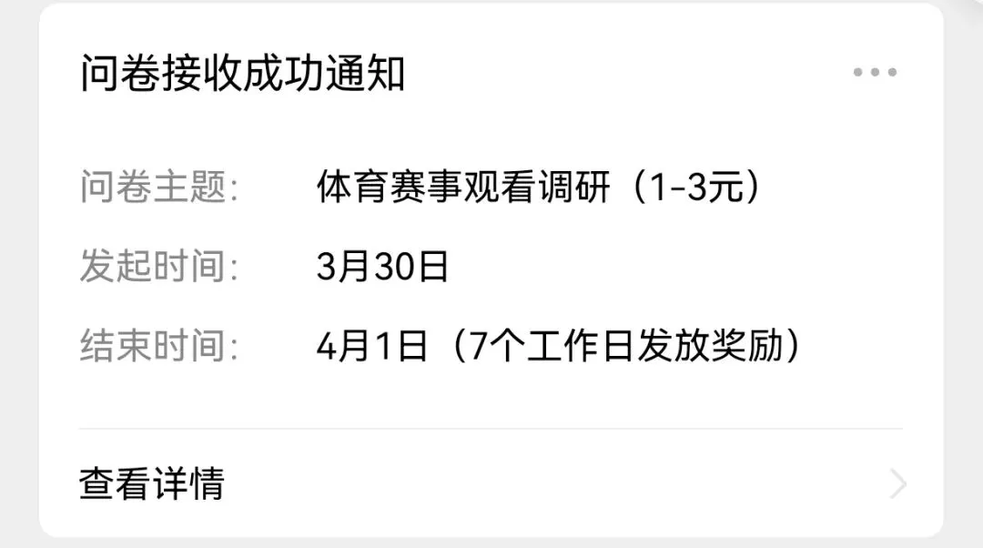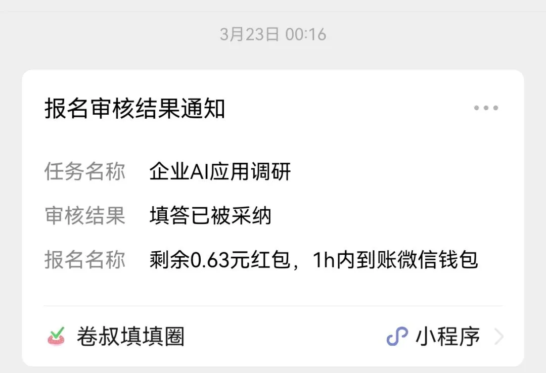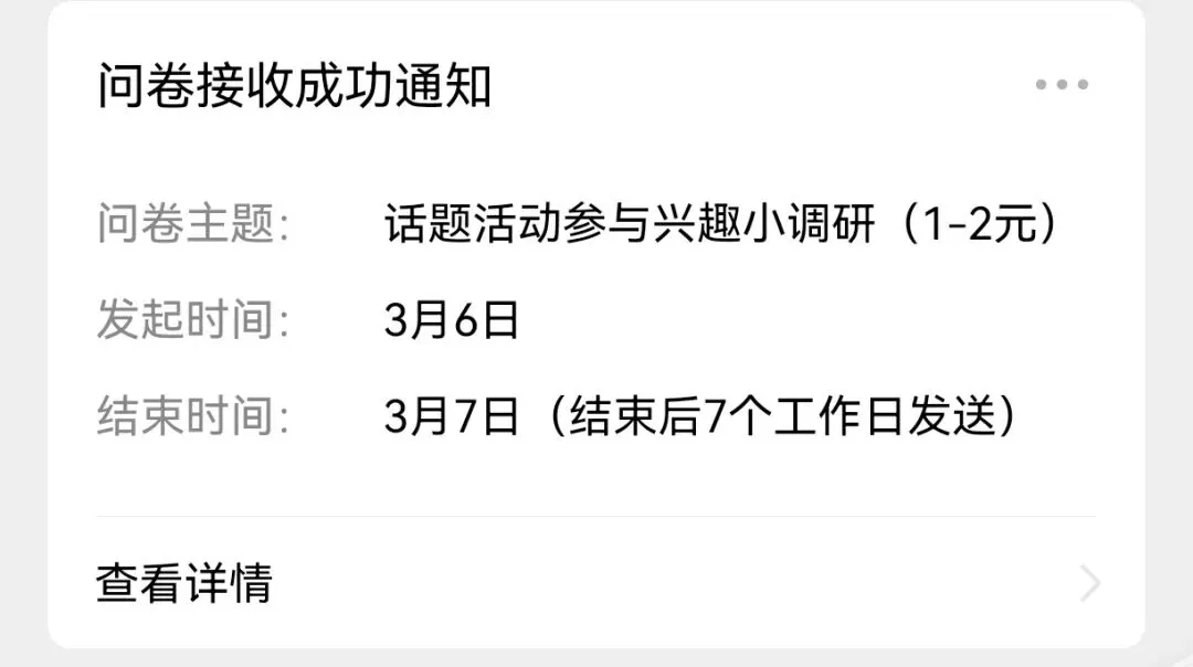 红包发出后,有效期是24小时,超过24小时红包就会被退回,不再补发哟~领完红包后,保持关注公众号,就能陆续接收到调研问卷任务啦。接收到问卷任务后,要尽快点开完成填写,否则可能会出现手慢无的情况,毕竟问卷份数是有限的…接收到问卷任务后,要尽快点开完成填写,否则可能会出现手慢无的情况,毕竟问卷份数是有限的…认真完成问卷题目作答后,坐等现金奖励直接到账微信钱包。建议大家务必认真填写问卷,以确保审核过关,奖励顺利到账,并且获得更多问卷任务推送。