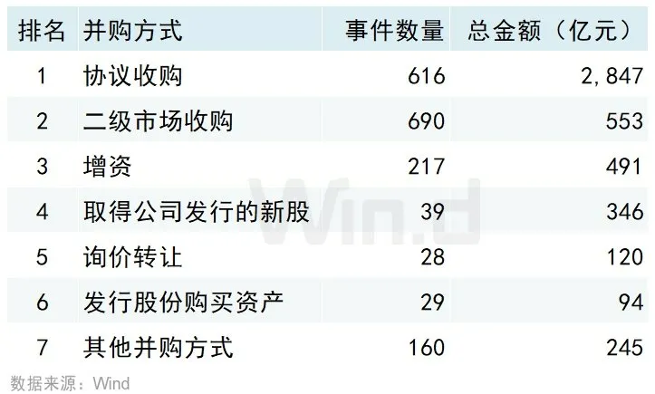 从并购方式分布来看,协议收购类并购事件以2,847亿元的规模位列第一,占到总体规模的60.63%;二级市场类并购事件以553亿元的规模位列第二,占到总体规模的11.78%;增资类收购事件491亿元为第三位,占到总体规模的10.45%。