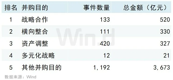 从各参与方的并购目的分布来看,战略合作类的并购事件以520亿元规模占到总体交易规模的10.67%,横向整合和资产调整分别以330亿元和327亿元占到总体交易规模的6.77%和6.71%。