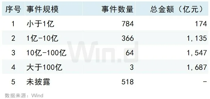 从并购规模分布来看,交易金额大于100亿元的事件占比最高,占总体交易金额的37.14%。占比第二高的是交易金额在10亿元到100亿元的事件,占总体交易金额的34.05%。