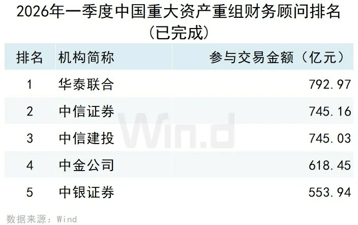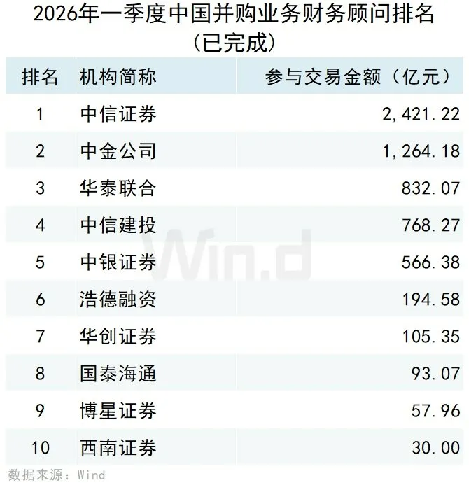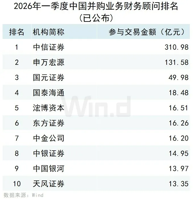 以财务顾问或者独立财务顾问身份参与并购事件的规模来看,按照事件首次公告日在2026年一季度的口径统计,排名第一的是中信证券,交易规模为310.98亿元;排名第二的是申万宏源,交易规模131.58亿元;排名第三的是国元证券,交易规模为49.98亿元。