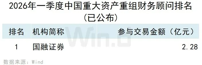 从机构担任财务顾问或者独立财务顾问参与的重大资产重组事件规模来看,按照事件首次公告日在2026年一季度的口径统计,排名第一的是国融证券,交易规模为2.28亿元。
