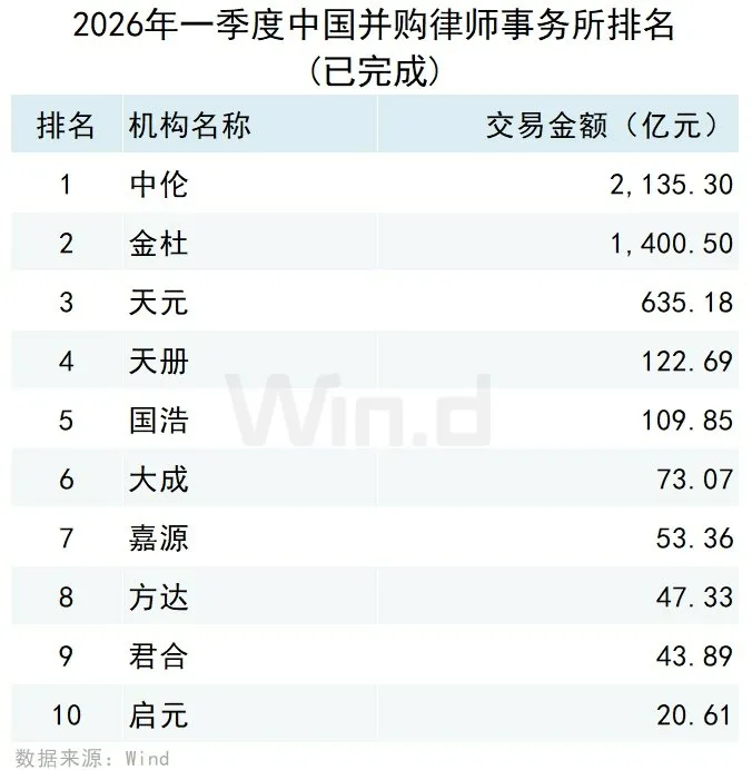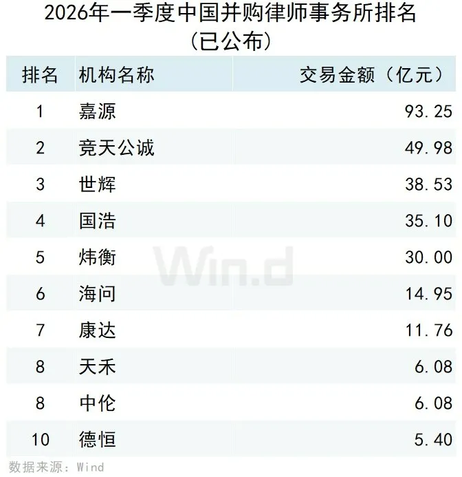 从律师事务所参与并购的规模来看,按照事件首次公告日在2026年一季度的口径统计,嘉源律师事务所以93.25亿元的交易规模排名第一;竞天公诚律师事务所以49.98亿元的交易规模位列第二名;世辉律师事务所38.53亿元的交易规模位列第三名。