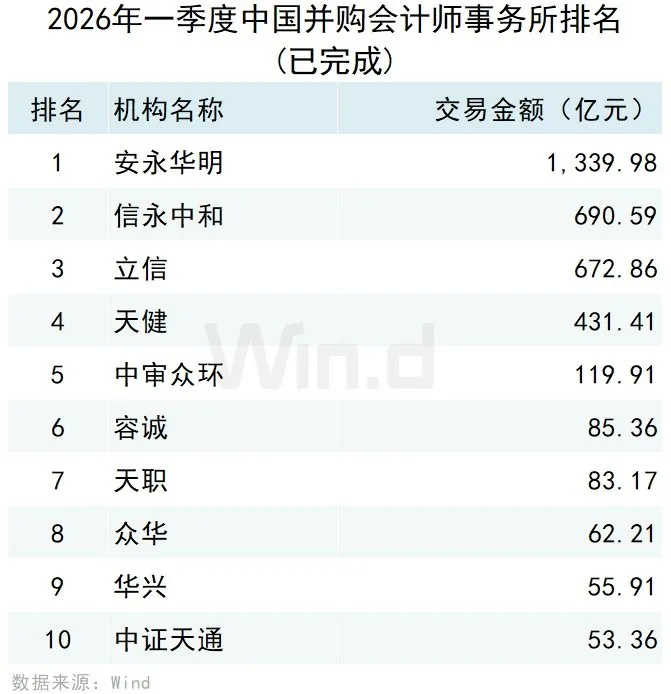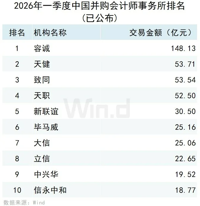 从会计师事务所参与并购事件的规模来看,按照事件首次公告日在2026年一季度的口径统计,排名第一的是容诚会计师事务所,交易规模为148.13亿元;排名第二的是天健会计师事务所,交易规模为53.71亿元;排名第三的是致同会计师事务所,交易规模为53.54亿元。