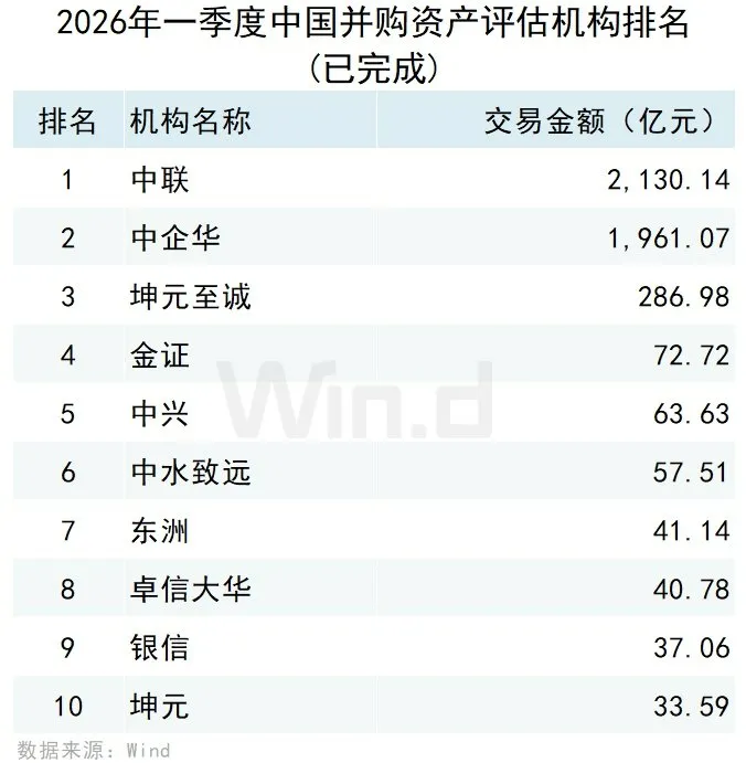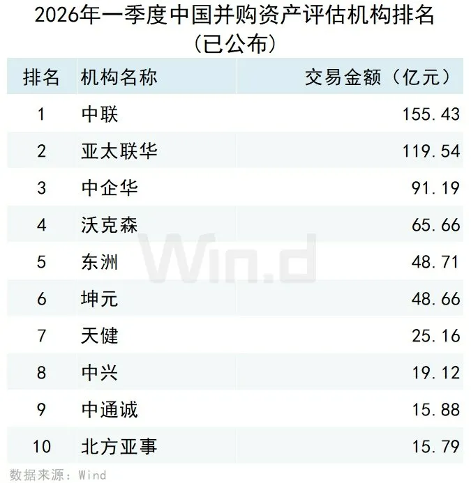 从资产评估机构参与并购事件的规模来看,按首次公告日在2026年一季度的口径统计,中联资产评估以155.43亿元的交易规模排名第一,亚太联华资产评估和中企华资产评估分别以119.54亿元和91.19亿元的交易规模位列第二名和第三名。