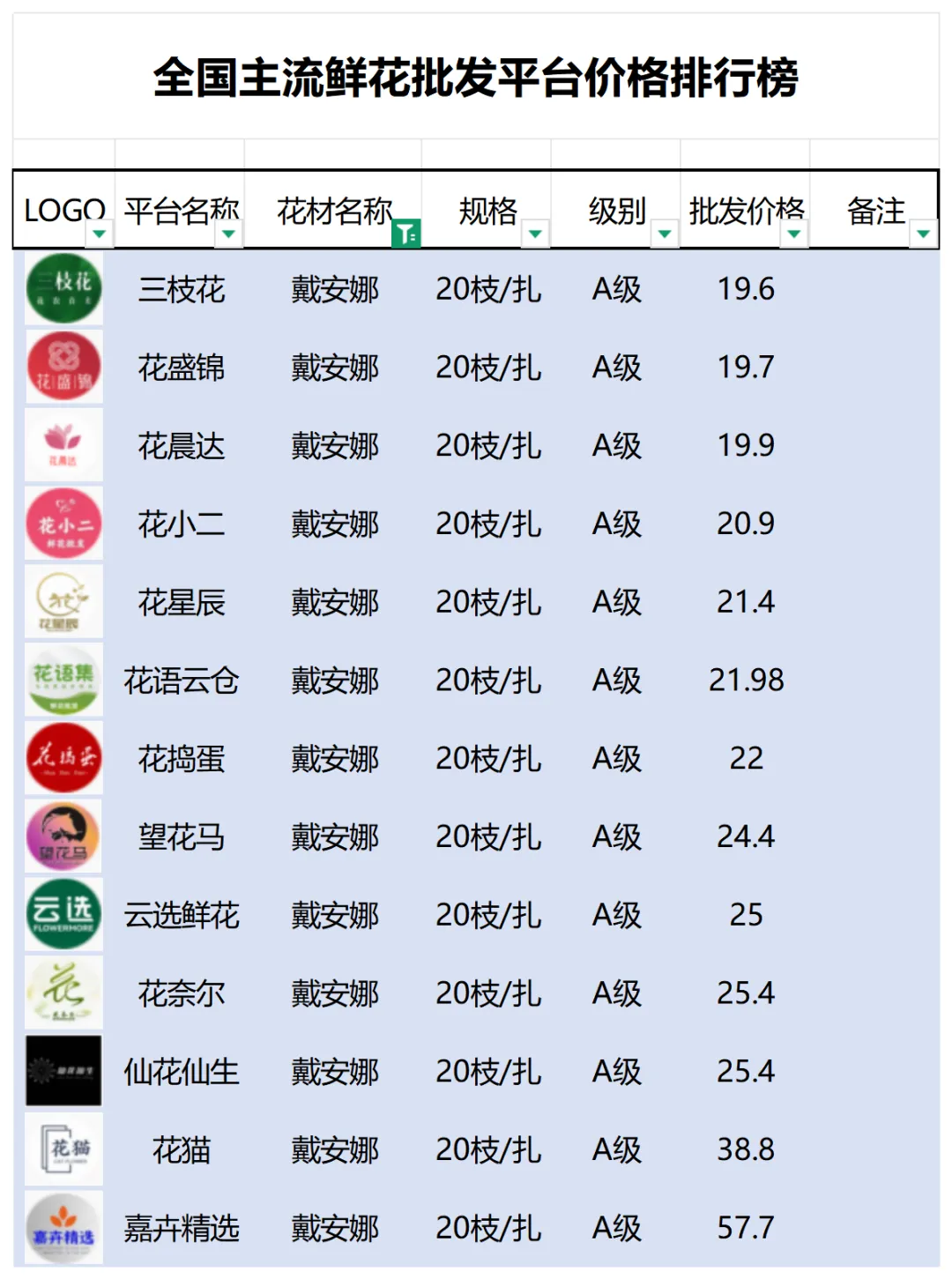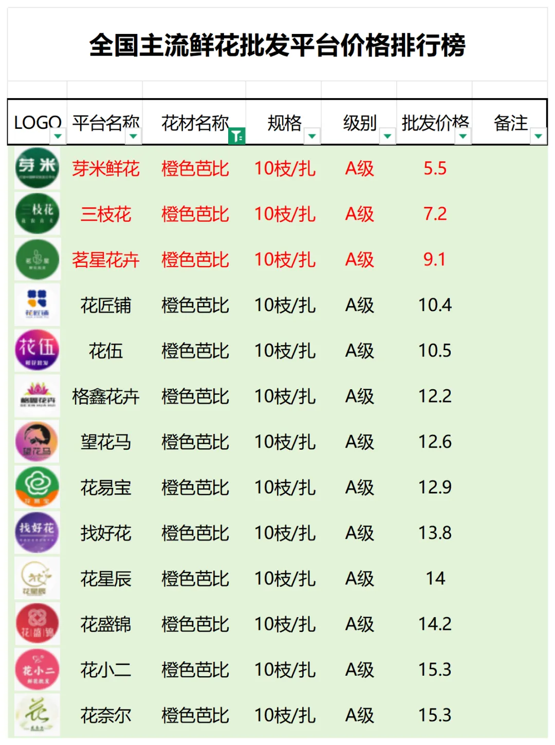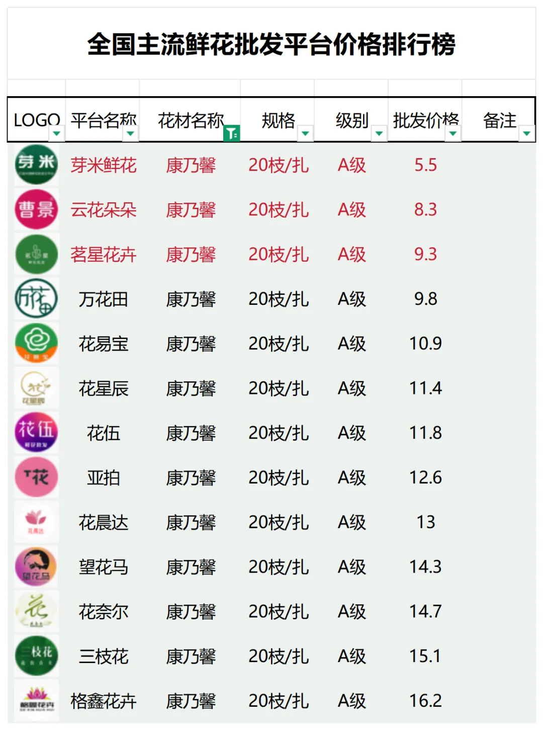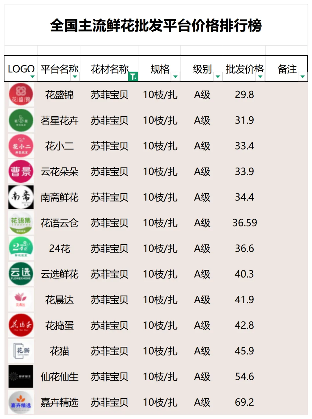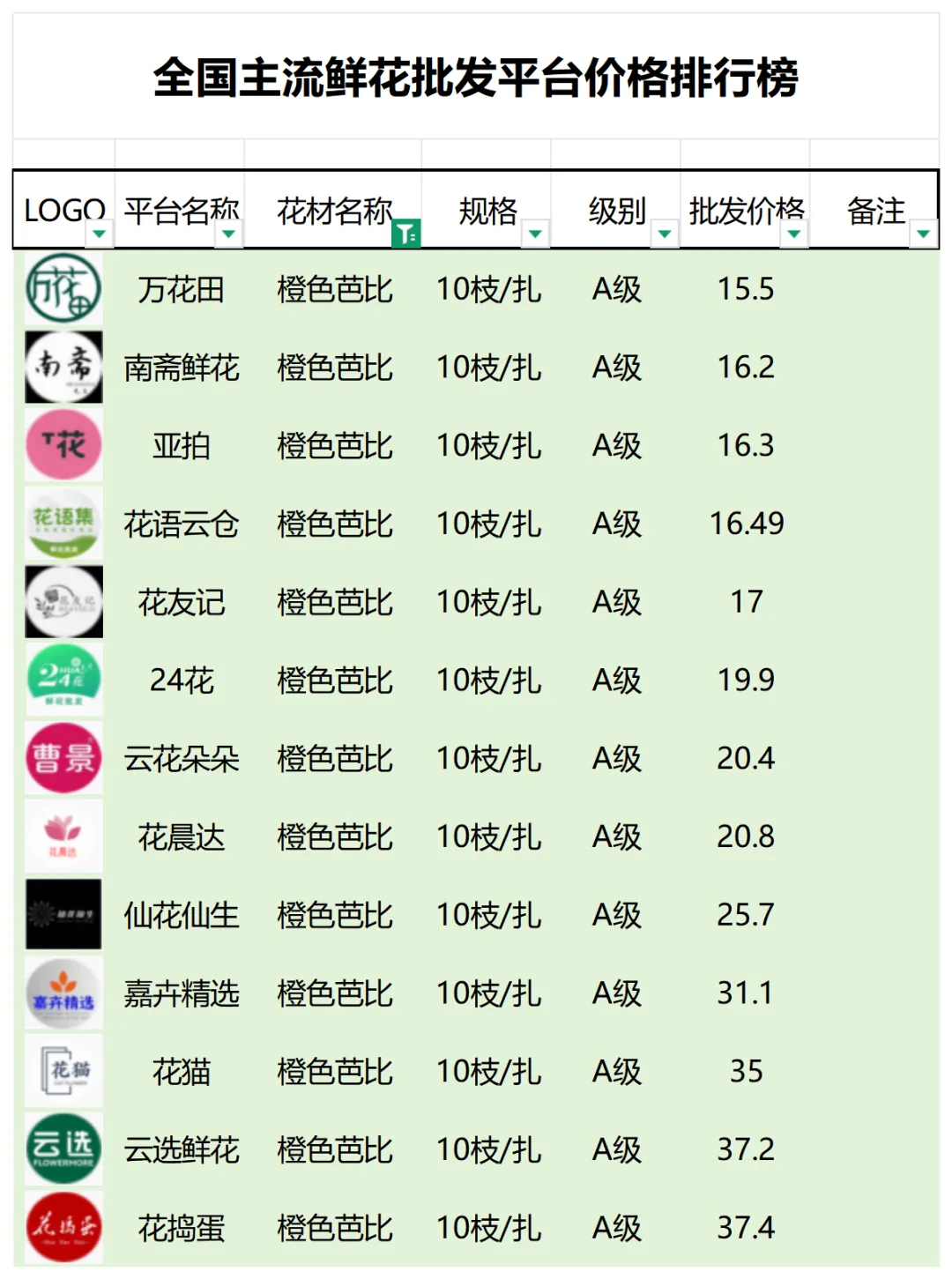 2、本数据只收录A级花材批发价格,覆盖全国大部分主流鲜花批发平台