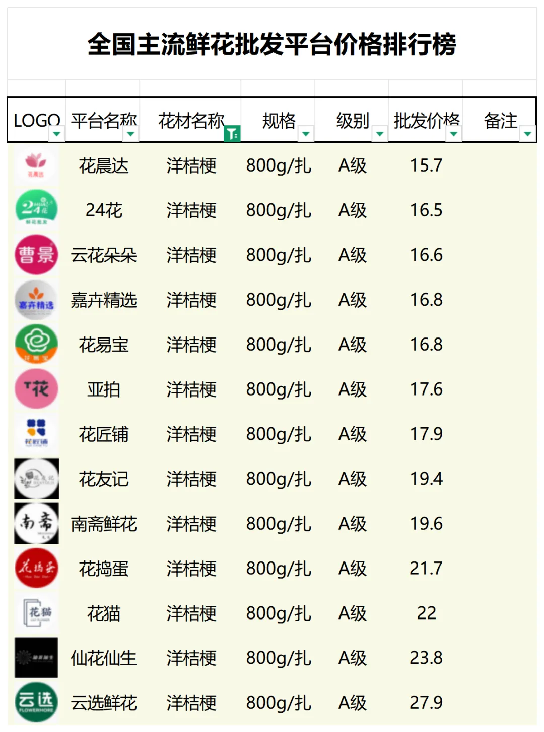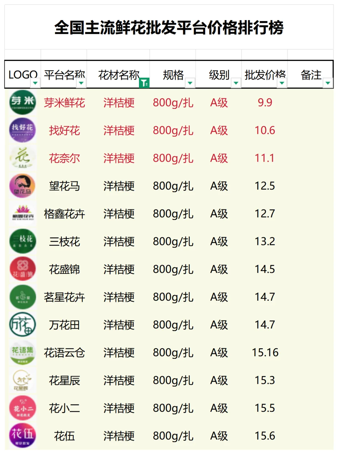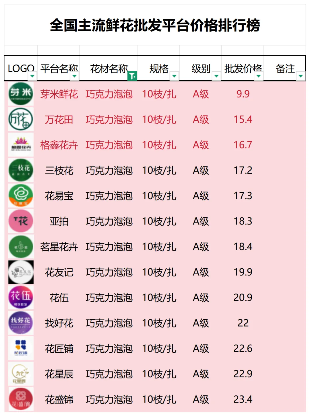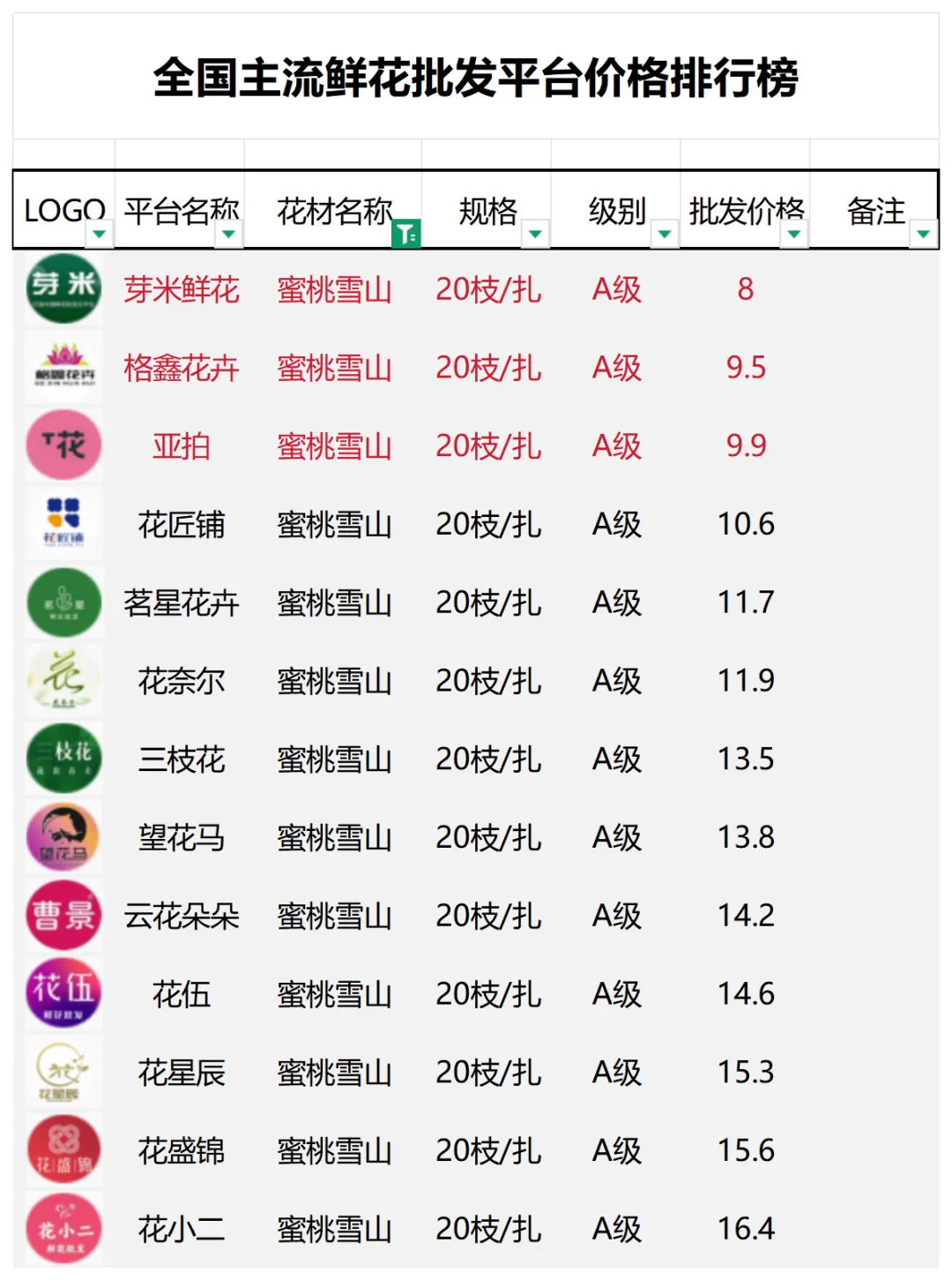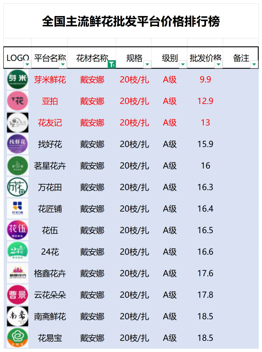 2、本数据只收录A级花材批发价格,覆盖全国大部分主流鲜花批发平台