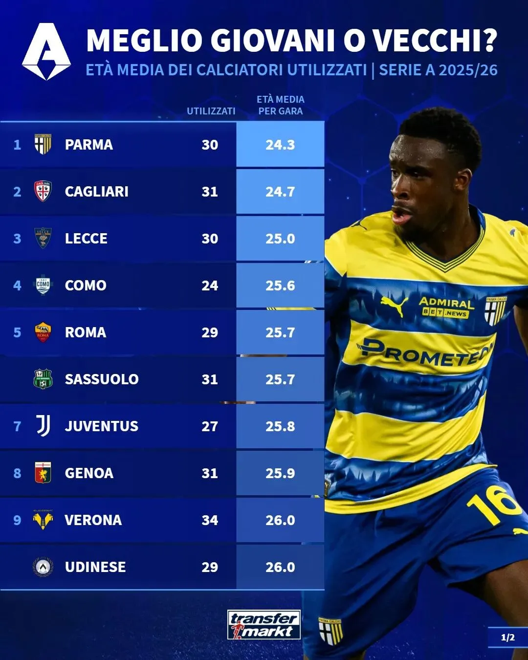 31出场平均年龄24.7岁,他们与帕尔马是两支仅有的出场球员平均年龄小于25岁的球队。莱切排在第三名,30人出场平均年龄为25岁。