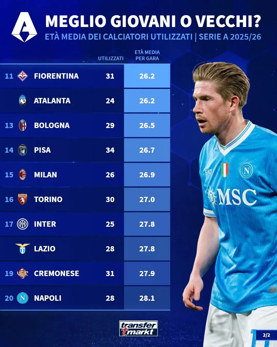 在本赛季意甲联赛中出场球员平均年龄最大的是那不勒斯,他们一共有28人在联赛中出场,平均年龄28.1岁,是唯一一支平均年龄超过28岁的球队。国际米兰与那不勒斯相差得并不多,25人出场平均年龄27.8岁,与拉齐奥并列倒数第三名。另外AC米兰出场球员的平均年龄也有26.9岁,排在第15名。