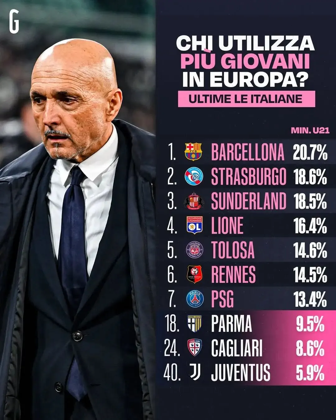 在欧洲五大联赛中,意甲对年轻人的使用上相对来说不算友好。根据米兰体育报的一项统计,本赛季U21球员出场时间占总出场时间的比例,巴塞罗那以20.7%高居榜首,前10名中有包括巴黎圣日尔曼在内的多支法甲球队,而意甲没有球队进入前10名,前20名中也只有帕尔马一个,队中U21出场时间比例为9.5%,再往后排则是第24的卡利亚里(8.6%)和第40的尤文图斯(5.9%)。