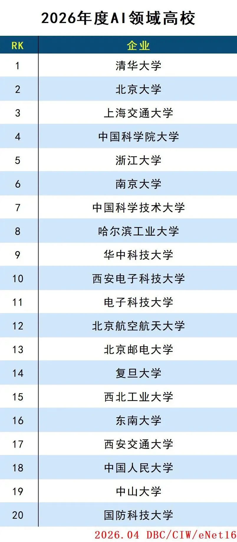 近期,德本咨询发布《2026年度AI领域高校》排行榜,其中清华大学、北京大学和上海交通大学位列前三名。