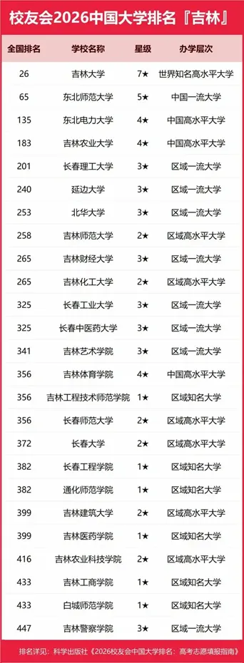 2026年校友会中国大学排行榜公布之后,再次引起人们对吉林省高校排名的关注。每次榜单发布都会引起很多的讨论。该份最新的名单可以作为观察吉林高等教育现状的一个窗口,上面列出的是省内二十五所主要的本科院校。对今年参加高考的学生及家长来说,这些都是十分重要的参考。