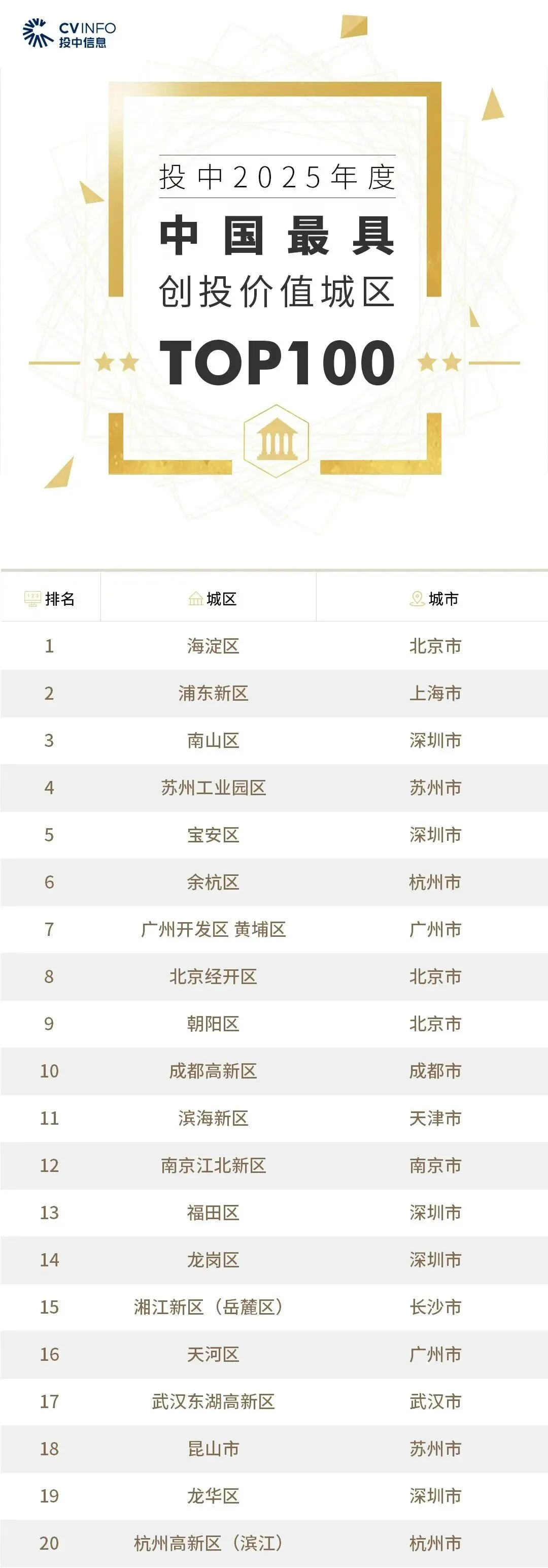 在刚刚结束的2026中关村论坛年会现场,国内权威私募股权投资研究机构投中信息正式发布“2025年度中国最具创投价值城区TOP100”榜单。