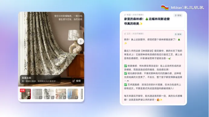 先说怎么解决“没人进店”的问题。现在客户都刷抖音、小红书,你得让客户在网上看到你。以前你得花钱请人拍视频写文案,现在米兰软装超级AI智能体帮你全搞定。你对着窗帘布料拍张照片,AI自动给你生成精美的图片、有吸引力的文案,还能剪出短视频,直接就能发到抖音和小红书上。连热门话题都帮你配好了,发出去就是爆款的底子。
