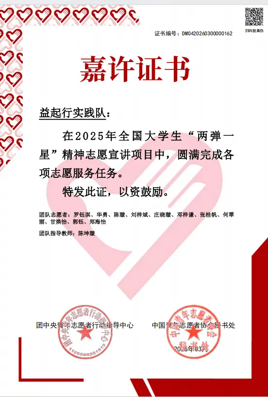 这次的嘉许,不仅仅是一张证书,更是一份激励、一份责任。它证明,将青春融入家国情怀,用创新传承红色基因,可以在乡村沃土上绽放出耀眼的光芒。益起行实践队的故事,是当代青年立志民族复兴、投身强国建设的生动缩影,他们的脚步,必将更加坚定、有力。