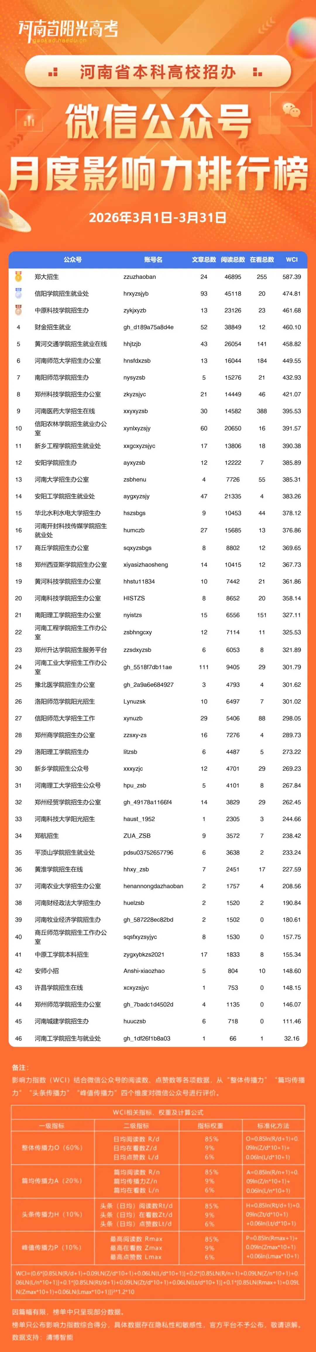 2026年3月,河南省本科高校招办微信公众号累计发布推文820篇,阅读总数47.1383万,平均WCI为309.86。本月各本科院校数据均有所上升。