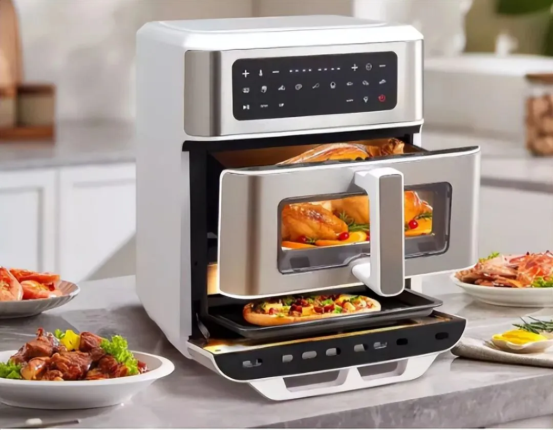 上下两个炸仓可以分开设定温度和时间,同时烹饪两种不同的食材。上面炸薯条、下面烤鸡翅,互不串味,效率直接翻倍。