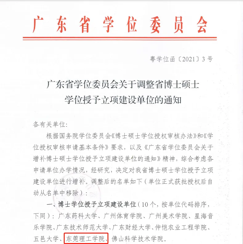 学校现有9个广东省重点建设学科,工程科学学科进入ESI全球排名前1%。在原有计算机科学与技术、机械和资源与环境等3个硕士学位授权点基础上,拟新增土木工程、材料与化工等8个硕士学位授权点,研究生教育规模将进一步扩大。2018年10月学校成立国际联合研究生院,与国外高水平大学联合培养博士;已与诺丁汉大学、斯威本科技大学、奥克兰大学和爱丁堡龙比亚大学等高校建立合作,共招收博士19名,国际联合培养博士有力地提升了学校人才培养层次。学校于2014年经广东省人力资源和社会保障厅批准设立广东省博士后创新实践基地,先后与华南理工大学、西安交通大学、电子科技大学、中国科学技术大学、天津大学、暨南大学等高校开展合作,联合培养博士后,至今累计进站130余人,是东莞市博士后工作站(基地)中在站人数最多的单位。根据5月25日《广东省学位委员会关于调整省博士硕士学位授予立项建设单位的通知》(粤学位函[2021] 3号),莞工正式获批“博士学位授予立项建设单位”。