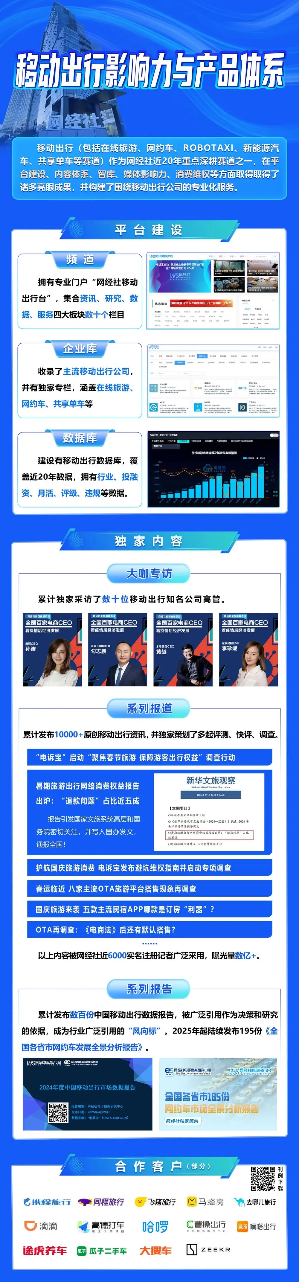 移动出行(包括在线旅游、网约车、robotaxi、新能源汽车、共享单车等)作为网经社近20年重点深耕赛道之一,在平台建设、内容体系、智库、媒体影响力、消费维权等方面取得取得了诸多亮眼成果,并构建了围绕移动出行公司的专业化服务。