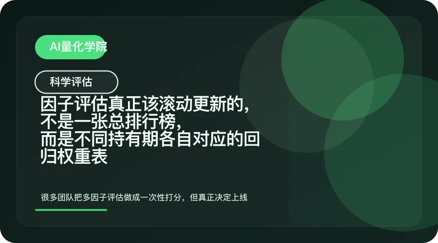 所以,因子评估真正该滚动更新的,不是一张总排行榜,而是不同持有期各自对应的回归权重表。前者更像展示材料,后者才像生产说明书。只有把持有期、滚动窗口和权重映射正式做进流程,团队才不会把因子研究停留在“哪几个分高”这种实验室视角,而能进入“哪套权重适配哪种资金节奏”的工程视角。