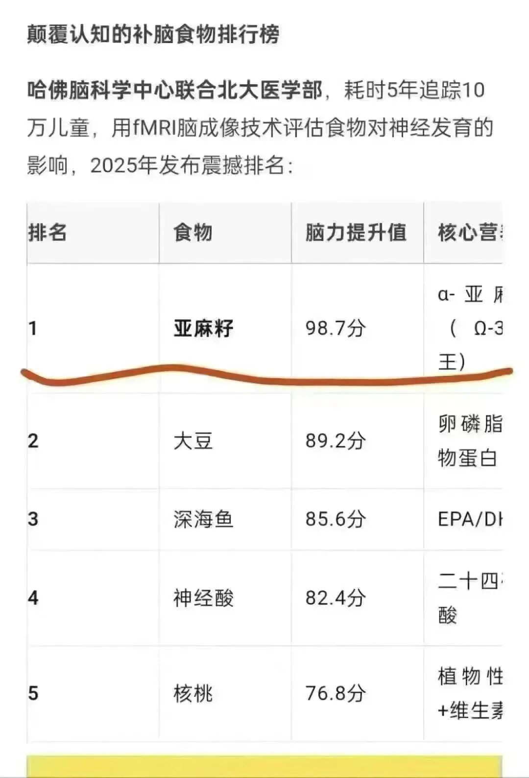 排第一的,不是昂贵的三文鱼,也不是传统的核桃,而是——亚麻籽!其脑力提升值高达98.7分!相比之下,深海鱼只排第三,得分为85.6分。