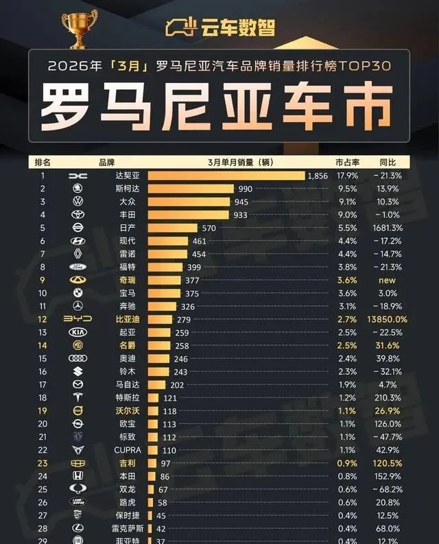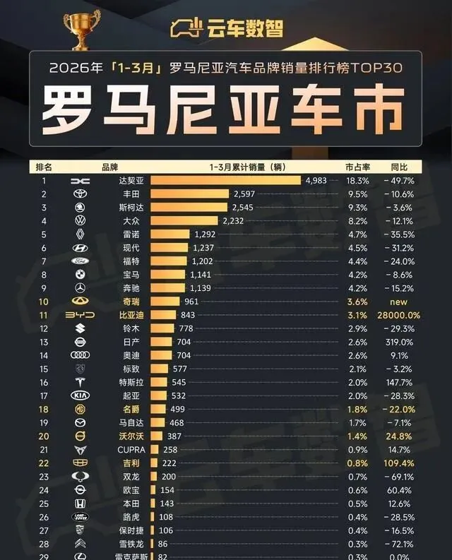刚刷到罗马尼亚那边2026年3月的车市数据,说实话,看完真有点坐不住,这哪是普通的月度销量榜啊,简直就是一场中国汽车品牌在东欧老牌地盘上的“暴力拆迁”现场。咱们都知道罗马尼亚有个神车品牌叫达契亚,那可是欧洲版的五菱宏光,常年霸着自家门口的销冠宝座,谁想今年开春这帮中国车企跟开了挂似的,硬生生是把这块铁板给凿穿了。