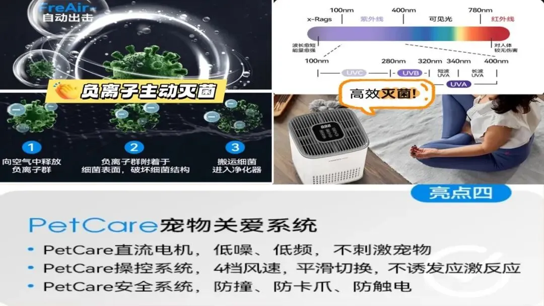 灭菌和宠物友好性方面,FreAir Lite 在滤芯结构中加入了 HEPA 过滤,并辅以UV双波段紫外线和负离子温和地减少细菌和过敏原;机身还配备倾倒断电、童锁、防卡爪等设计,宠物日常活动频繁也不容易出意外。
