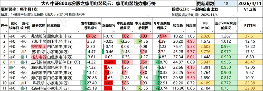 001、2025年11月4日家用电器趋势排行榜栏目正式上线。发布时12家属于中证800指数成分股。第4期时只有11家处于中证800成分股,四川长虹、飞科电器被踢出中证800成分股,苏泊尔被调入中证800成分股。