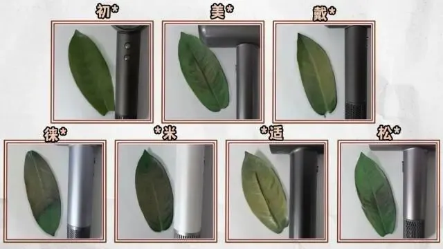 ▍测评方式:用新鲜叶片模拟发丝,各机型调至日常常用档直吹叶片 3 分钟,观察叶片水分保留情况、色泽变化及完整度。